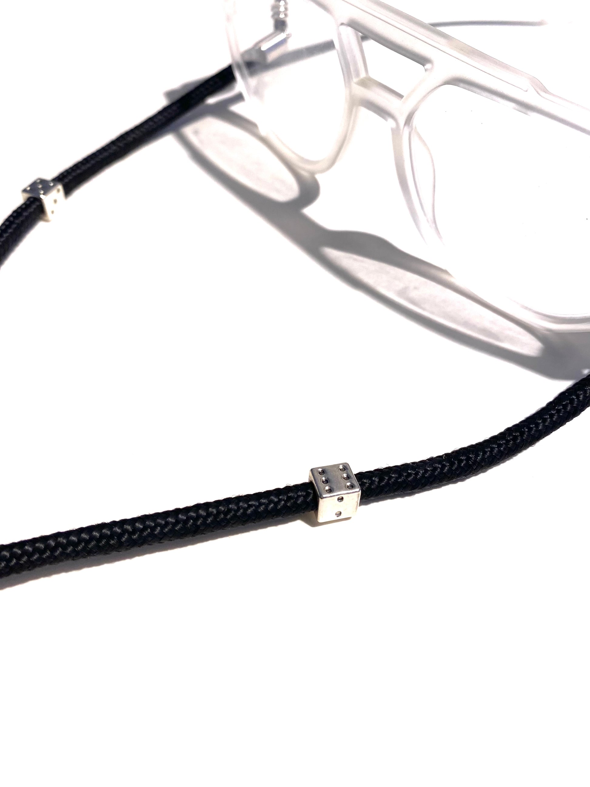 Sleek, minimalist, and Secure. This strap features a durable black woven cord accented with small, detailed silver dice charms. It’s the perfect blend of minimalist design and playful rebellion, keeping your glasses exactly where you need them with an effortlessly cool edge. These subtle charms add a sense of fortune into your daily look.